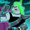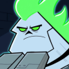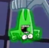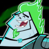 Description: A full body shot of Skulker's true blob form. He is being held by Danny Phantom, and he looks angry about it.